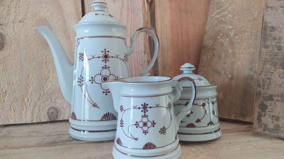 Home / Koffiepotten / bijzonder set Saksisch servies, koffiepot met suikerpot en melkkannetje aparte kleur !!