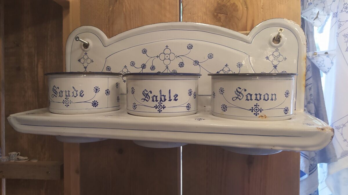 Blauw saks emaille rekje met 3 bakjes met Franse tekst: